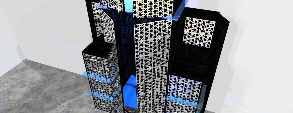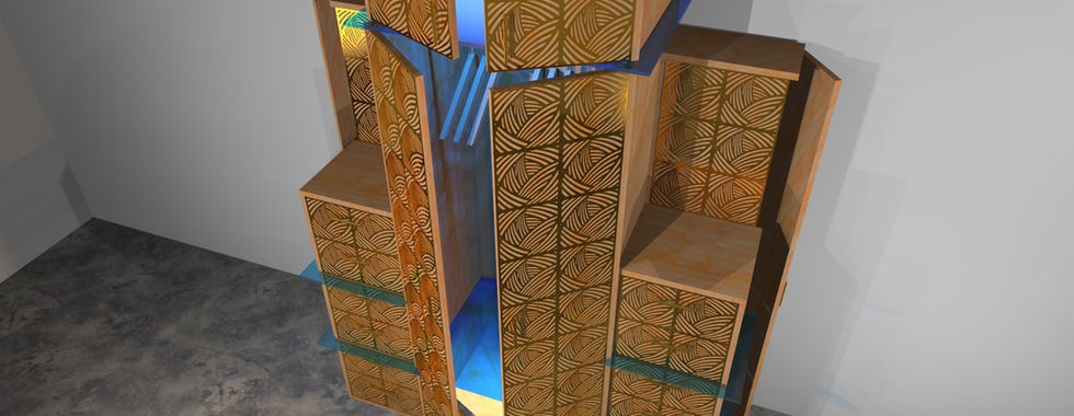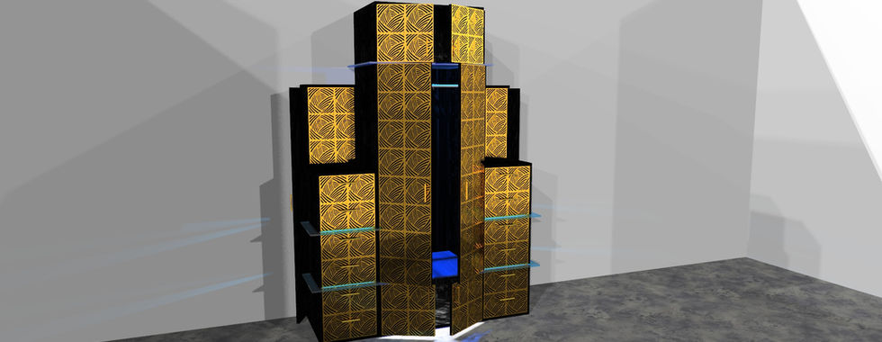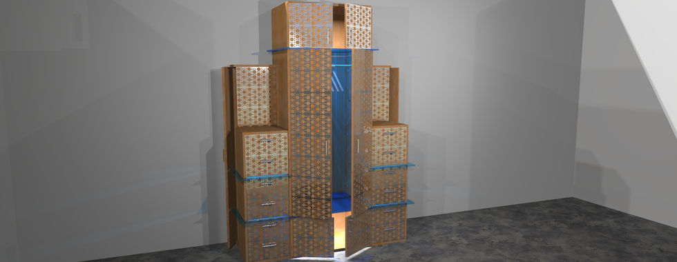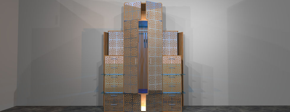 La grande penderie "Cubique" est une structure générale en bois habillée de placages en métal chrome ou laiton en façade.
